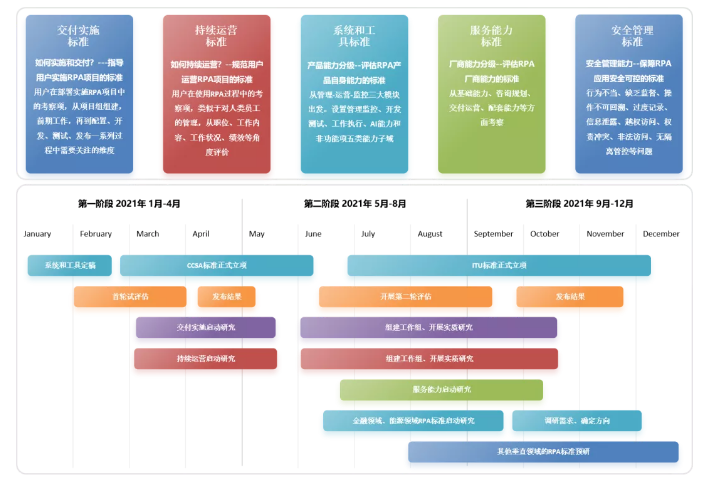 2021年方阵计划推进在研标准1项(机器人流程自动化能力评估体系 第3部分:系统和工具),预计在2月初完成定稿,同时推动该标准在ITU-T和CCSA的研究;启动新制定标准2项(第1部分:交付实施标准和第2部分:持续运营标准),两项标准将分别组建专家组同步推进研究,计划3月启动预研工作,预计8月底完成定稿;同时将启动面向金融领域、能源领域的RPA专项标准预研工作。