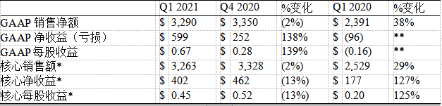 · GAAP销售额与核心销售额均为33亿美元,分别实现38%和29%的同比增长