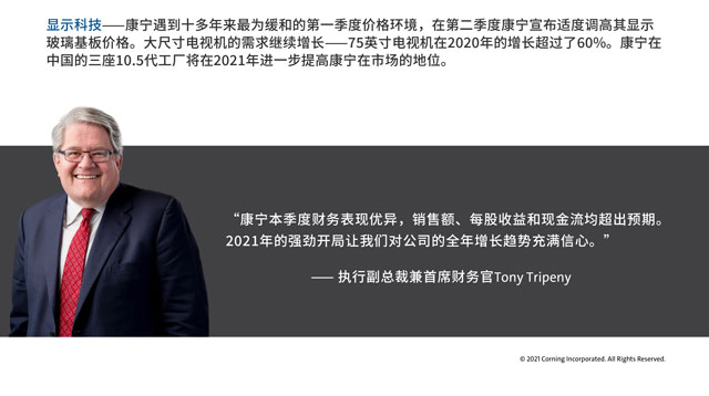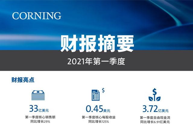 执行副总裁兼首席财务官Tony Tripeny表示:“康宁本季度财务表现优异,销售额、每股收益和现金流均超出预期。2021年的强劲开局让我们对公司的全年增长趋势充满信心。”
