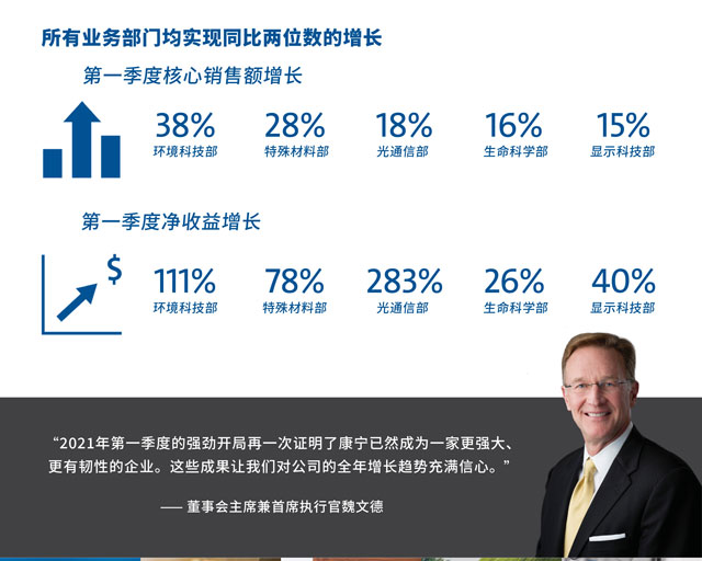 董事会主席兼首席执行官魏文德表示:“2021年第一季度的强劲开局再一次证明了康宁已然成为一家更强大、更有韧性的企业。这些成果让我们对公司的全年增长趋势充满信心。”