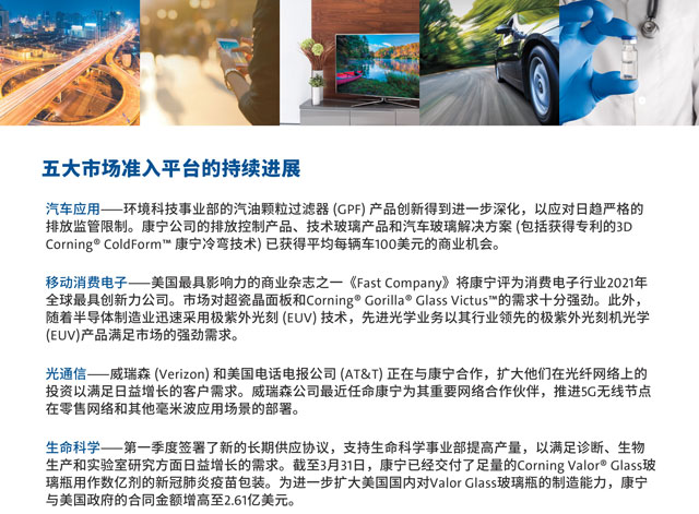 康宁公司继续在其五大市场准入平台上推进重要的增长举措。重点包括: