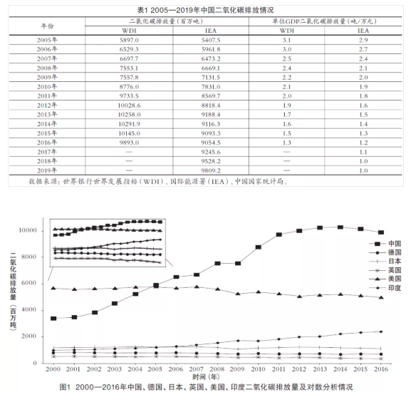 随着中国经济迅速发展和生产活动快速扩张,二氧化碳排放量也呈上升的趋势。根据国际能源署(IEA)的数据,中国二氧化碳总体排放量从2005年的54.07亿吨增长到2019年的98.09亿吨,增长将近一倍(见表1)。根据世界银行统计,2005年中国超过美国成为世界第一大碳排放国,到2016年,中国碳排放占世界总排放量的29%(见图1)。