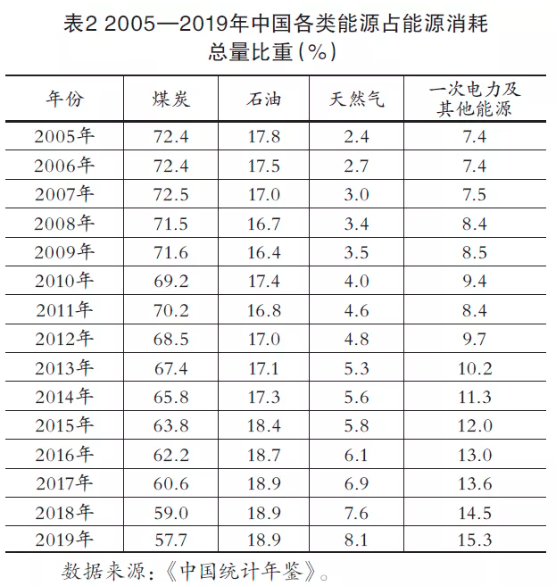 近年来,中国一次能源消费结构呈现出明显的低碳化、清洁化趋势(见表2)。2005—2019年煤炭消费量比重从72.4%下降至57.7%,共下降14.7个百分点;天然气消费量则从2.4%提高到8.1%,清洁能源(一次电力及其他能源)消费量从7.4%提高到15.3%,合计占比提高13.6个百分点。