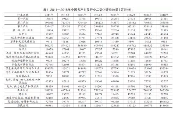 公式中各类能源的相应数值见表3。根据公式测算中国各产业及行业二氧化碳排放量结果见表4。