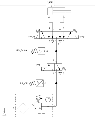Ø 气缸的往复运动由换向阀1VA控制,安全功能由带阀芯位置监控功能的安全阀0V1&0V2控制