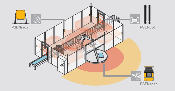 如果人员必须经常进入危险区域或手动进料,那么就适合用光学传感器搭配防护装置来进行安全防护。Pilz的安全雷达系统PSENradar、安全激光扫描仪PSENscan和光幕PSENopt II,可以向用户提供“量身定做”的支持。