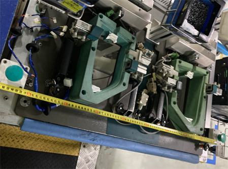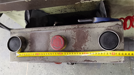 双手按钮的错误应用:操作按扭之间的距离达到950mm,距离太远,操作不便,不符合人机工程学