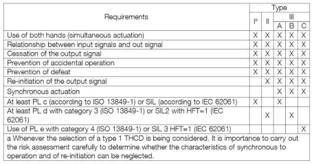 表1 List of types of the THCD (Two-hand control device ) and minimum safety requirements