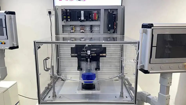 在2022线上工博,欧姆龙展示的一台新样机就为这些课题提供了解决对策。这台样机应用了欧姆龙无晃动液体灌装搬运的抑振参数自动生成技术,模拟在液体搬运高速化的过程中,通过FB自学习生成振动抑制参数,无需外部传感器就能实现抑制液体振动。