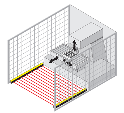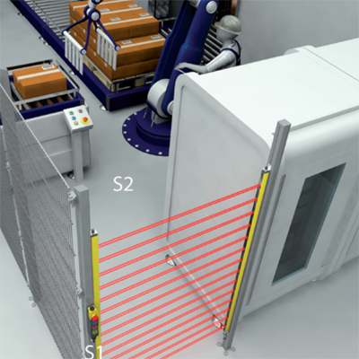 如果货物或物体需要不停地进出危险区域,安全光幕必须能够自动暂停。采用两个或四个muting信号用于探测是否有人员接近危险区域,或输送系统正在进入或离开危险区域。Muting输入可以来自光电开关、接近开关或限位开关。