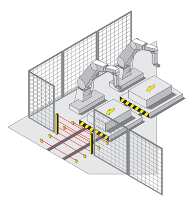 在这些光电防护装置(AOPD)中,发射器和接收器分别安装在两个独立的附件中。发射器发射一个红外信号,由接收器进行评估和监控。如果光束被物体或人打断,则发出停止信号,使机器停止运行。