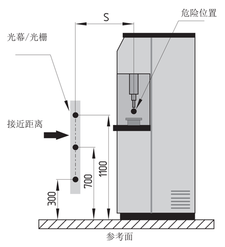 AOPD到危险区域所需的安全距离主要取决于整个系统的停止时间和AOPD的分辨率。安全光栅或光幕的尺寸以及安装方式必须确保在人员或身体部分进入危险区域之前发送停止信号并停止危险情况。