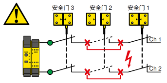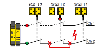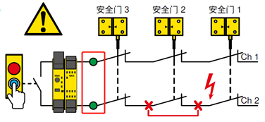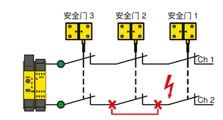 简而言之,带有无电势触点的开关(例如安全门开关,安全门锁,非接触式安全开关,急停按钮等)串联时可能出现故障掩蔽。控制单元(安全继电器或者安全PLC)仅评估完整串联的信号,因此可能妨碍故障识别。