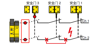 ③ 在查找故障时操作了另一个安全开关(安全门3、1被打开,然后重新关闭)。由于此安全开关上没有故障,因此两个通道同步关闭。不再存在差异。