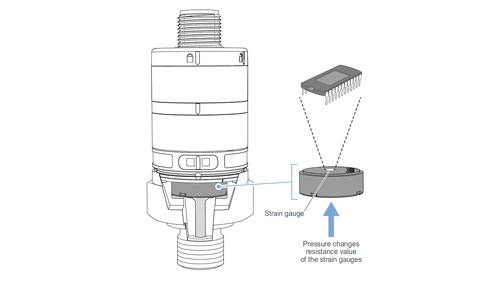 应变片被固定到不锈钢膜片上,作为惠斯通电桥连接。介质对不锈钢膜片的压力导致应变片的变形,从而产生电阻的变化。张力(正应变)增加电阻,压缩(负应变)减少电阻,桥接电路的输出信号按比例发生变化,且该变化由电子装置测得并转化为行业中常用的输出信号。