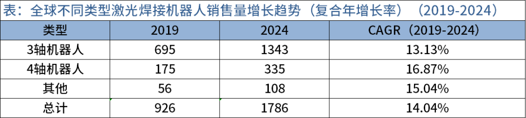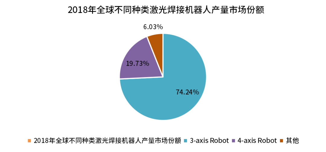 激光焊接机器人按照类型划分成3轴、4轴以及其他定制机器人,定制机器人可满足不同领域的焊接需求。研究数据表明,2018年激光焊接机器人的定制需求占据市场份额的6.03%,2019-2024年的复合增长率为15.04%,虽然3轴机器人占据着激光焊接机器人的主流,但我们不难看出,随着激光焊接的快速发展,激光焊接机器人的定制需求的前景也将十分可观。