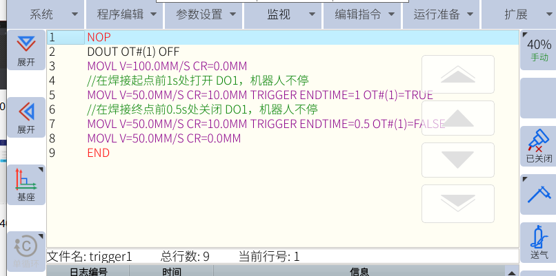 这就需要机器人能够在焊接轨迹的特定位置,按照设定的提早时间/距离,提前打开/关闭激光发生设备,以达到最佳的焊接效果。根据客户需求,艾利特机器人开发了对应的Trigger指令,用户可以方便的设置基于设定位置的提早时间(或者距离)的I/O控制,即运动不停又同时准确控制I/O。