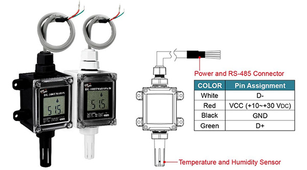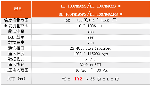 DL-100TM485S/ DL-100TM485PS/ DL-100TM485S-W/ DL-100TM485PS-W 是一款温湿度数据采集器。具备有 RS-485 通讯接口与 LCD 屏幕,可以显示各式温度、湿度与露点温度模块 ID 等数据。并且可以储存 4088 笔的温度与湿度。