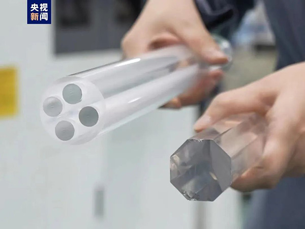 中外版本光纤预制棒对比 左为中国自主研发的圆形光纤预制棒,右为国际通用版八边形光纤预制棒