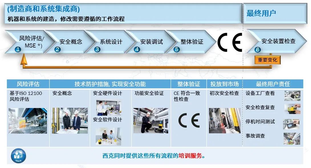 在了解了安全标准及其作用后,我们需要知道如何合理的使用安全标准,以最大程度的优化安全“投入汇报比”。通过对ISO 12100等标准的学习研究和西克近80年的安全领域工程经验汇总,提炼如下简易版的设备安全方法论: