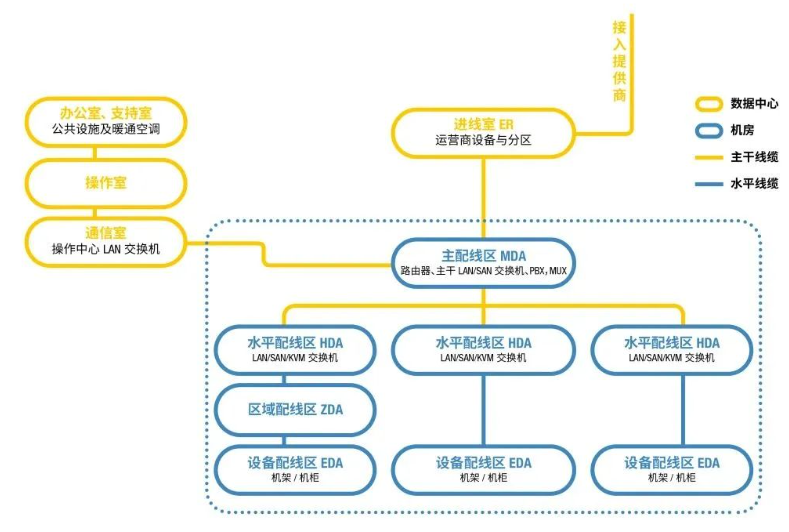 水平配区内设有汇聚层交换机、接入层交换机、SAN交换机和键盘/视频/鼠标(KVM)切换器,需测试单列内的水平配线区和所有设备配线区。