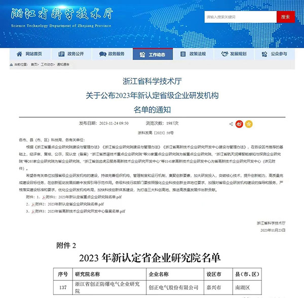 近日,浙江省科学技术厅公布了2023年新认定省级企业研发机构名单,创正电气股份有限公司获得 “浙江省级企业研究院”荣誉称号。这是继荣获“国家高新技术企业”“浙江省级高新技术企业研究开发中心”和“浙江省专精特新企业”荣誉称号之后,对企业科研实力的又一次认可。
