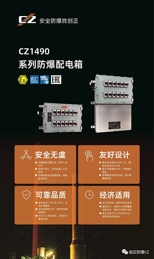 CZ1490防爆配电箱(IIB+H、IIIC/Db),同时拥有欧盟ATEX防爆认证、EAC海关联盟防爆认证及中国CCC认证,满足最新国际防爆标准,能够实现气体粉尘双重防爆,适用于潜在爆炸性危险区(1/2区、21/22区)和恶劣的工作危险区域。 外壳采用高密度铝合金一次成型(最大尺寸750mm*750mm*480mm),且表面防护采用静电喷涂环氧塑粉工艺,可选装箱体和箱盖之间的密封条实现IP67级防护,具有防护等级高、防腐性能好、防尘性能强、防水性能优的特点,兼具耐高低温特性(-55℃≤Ta≤+60℃),轻松应对化学场所、石油石化、海洋平台的复杂严苛环境。