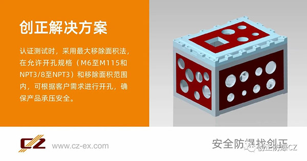 解决方案:在允许开孔规格(M6至M115和NPT3/8 至NPT3)和孔间距范围内,采用最大面积移除法进行开孔,既能满足客户各种开孔需求,又能确保产品的承压安全。