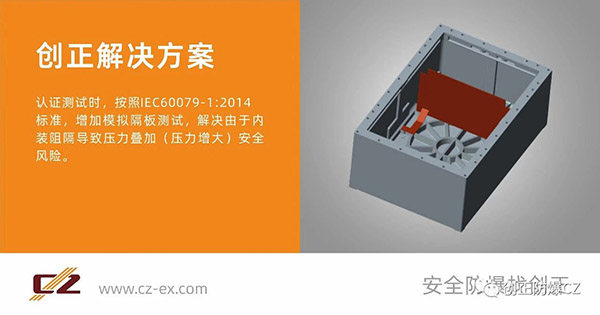 解决方案:按照IEC60079-1:2014标准,增加模拟隔板测试,解决由于内装阻隔导致压力叠加(压力增大)安全风险。