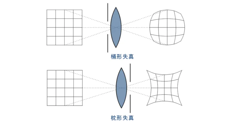 桶形失真通常与广角镜头(焦距<50mm,光圈前置结构)有关,而枕形失真常见于长焦镜头(焦距>50 mm,光圈后置结构)。须形失真则是这两种失真的混合形态,不太常见。
