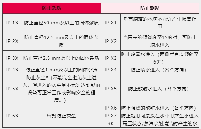 按照IEC60529的标准,IP等级明确了防止固体和液体进入的能力,IP等级标志的第一位涉及到固体物质(例如灰尘),第二位表示对水的防护等级。