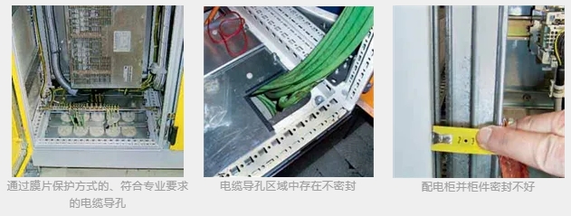 进线管理是保证IP等级的重要附件,不严密的电缆进入口密封、配电柜门的损坏(有缝隙等),并柜密封不当,或没有按照规定将指示器和操作装置安装在柜体表面,都将导致在不适合的操作情况下,在白天产生更多的冷凝水滴落,并使控制柜中产生较高的温度。威图完备的进线管理附件系统保证机柜密封等级,保护柜内环境的稳定可靠。