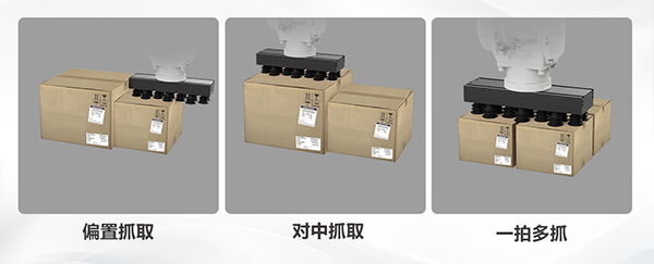 RP机器人视觉引导平台可以提供多种抓取顺序规则,通过拖拽式流程搭建和简单的参数配置,实现偏置抓取、对中抓取、一拍多抓、一抓多箱、智能端拾器抓取IO分配等多种抓取方式的应用,满足不同场景下对于抓取效率和生产柔性的个性化需求。