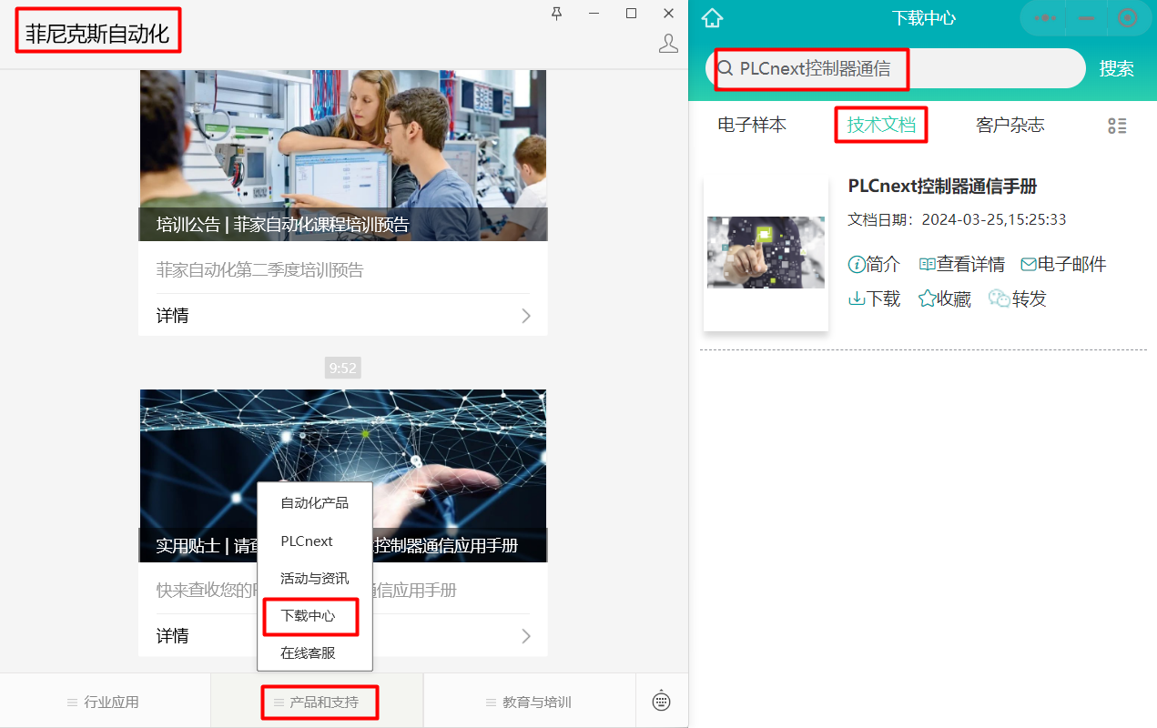 “菲尼克斯自动化”公众号内,选择“产品和支持”--“下载中心”,选择“技术文档”,在搜索框输入“PLCnext控制器通信应用手册”关键字,点击“搜索”,即可查看&下载文档。