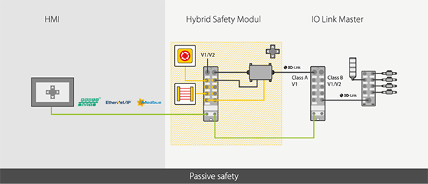 带无源安全性的分布式概念基于执行器与传感器电压之间的持续电隔离。在紧急情况下,可以安全关闭执行器电压,而传感器系统仍保持激活。优势:所需安全输入最少,可节省成本,且在紧急情况下仍可进行诊断。