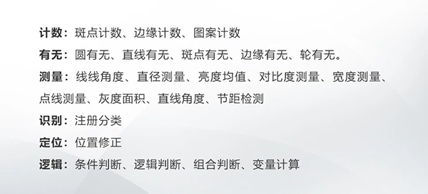 SC1000系列视觉传感器集成计数、有无、正反、尺寸测量、AI注册分类等20余种检测算法,覆盖各类常见传感应用场景,同时可对激光、光电、位置等传感器的一些应用的局限性进行有效的补充。