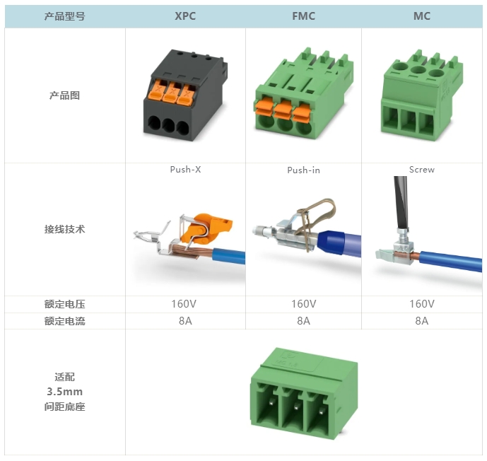 兼容不同接线技术产品,连接不受限!接线技术升级,电气性能保持不变,标准3.5mm间距设计,无需更改PCB设计,无缝切换上一代连接产品。