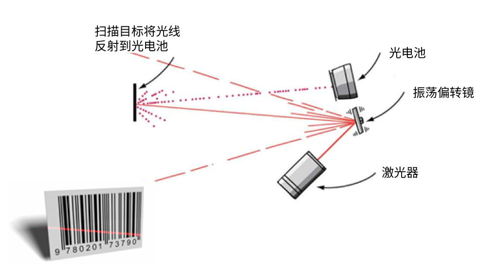 一个或多个激光束指向条形码。通过使用振荡镜、镜轮或任何其他光学系统,光束被转换成扫描线。扫描线在高速下穿过条形码。不同粗细的光,经条形码的白条和黑条条反射回扫描器。反射被光学装置收集并转移到光电二极管上。光电二极管将反射转换成电信号