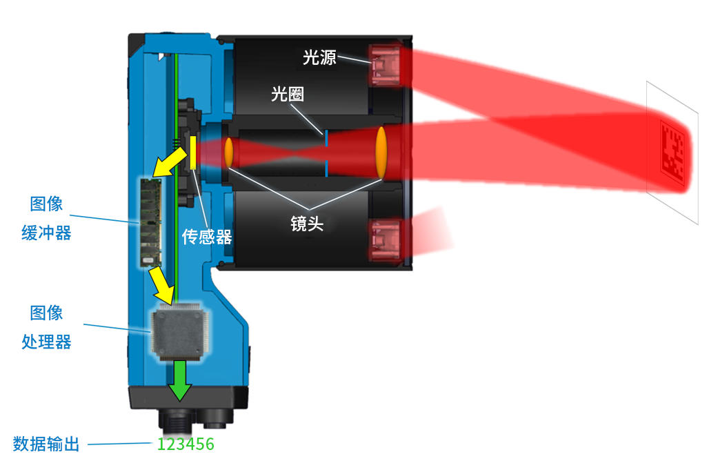 相机如人眼一样,所见即所得。看到条码后,将条码解析得到我们所能读码的信息传输给到大脑,通过语言换算后给到另外的人。