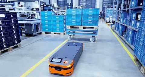 移动机器人取回托盘补给,一名员工在穿过车间的途中稍稍靠近它,它立即放慢了移动速度。