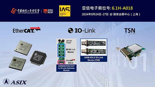 亚信电子即将于IAS 2024展示最新的亚信IO-Link主站/设备软件协议栈、集成亚信IO-Link主站软件协议栈的AX58400 EtherCAT转IO-Link网关,以及AXM57104A TSN PCIe千兆以太网卡解决方案。