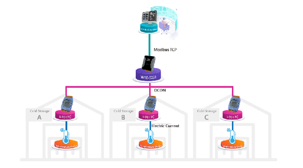 使用WISE系列 IIoT边缘运算智能控制器,搭配泓格远程I/O模块,将温度传感器的电流数据实时转换成温度数据并传送,即可远程监测低温仓库的环境温度。通过此方式,同时套用在多个仓库的温度数据收集,便能实时将每一个仓库的温度数据统一呈现于中控端,让管理者能有效率地掌握仓库温度的变化。