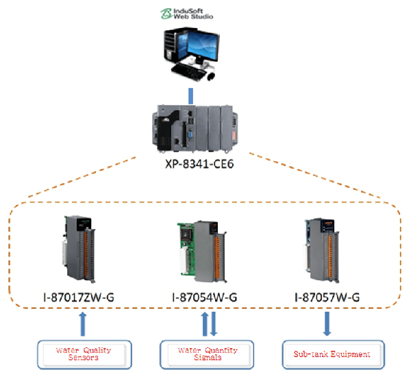 将数据传送至可程序自动化控制器XP-8341-CE6,进行水质与水量的数据传送及运算,而泓格PAC可以外接I/O扩充单元,以此协助PAC传送数据,因此能将所有不同类型的I/O模块所传回的数据,通过一个控制器做计算。最后把水资源数据回传到组态软件Indusoft,进行可视化数据分析与管理,提供管理人员执行远程监控作业,这就是泓格所提供的水资源监控解决方案,在中国台湾新山净水厂的实际应用案例。