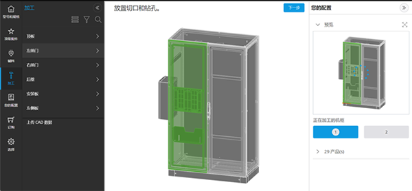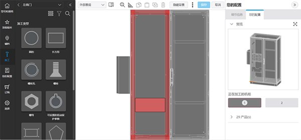 4、选择加工,为您的机柜门板添加加工钻孔信息。我们提供11种钻孔样式供您选择,或者您还可以将包含钻孔信息的CAD图纸进行上传,配置系统同样可以识别。