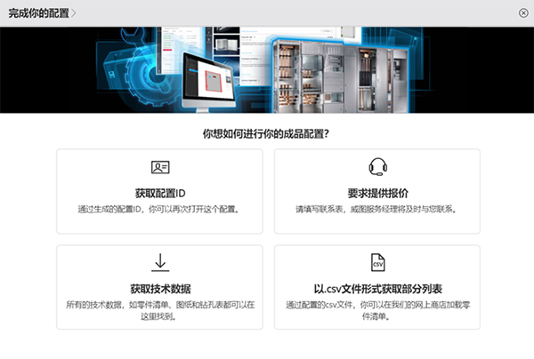 7、完成配置,您可以保存您选择的配置,生成对应的配置ID。通过配置ID可快速读取您的历史配置。同时我们还提供报价渠道、技术数据下载、以CSV文件形式获取零件清单。