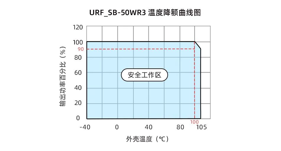 温度性能对于产品稳定性有着不可忽视的影响,该系列产品实现工作温度范围 -40℃ to +105℃(壳温),同时,URF_SB-50WR3系列满足标称输入100℃壳温下可带满载的优良性能。