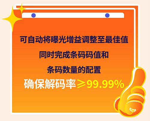 通过自动增益技术,可自动将曝光增益调整至最佳值,同时完成条码码值和条码数量的配置,确保解码率达到99.99%以上!