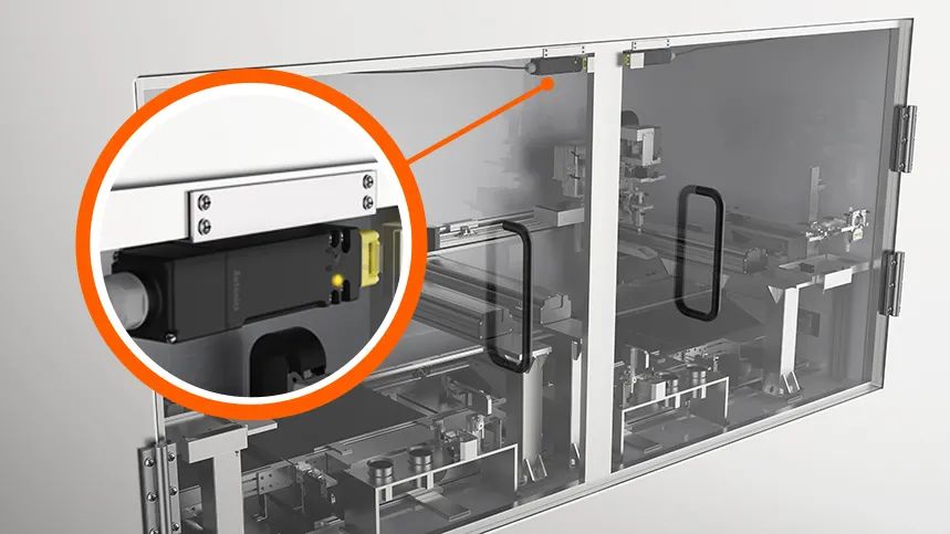 包装机上的安全门锁开关可在机器运行时保持门锁,只有在操作停止并且安全时才能打开门。