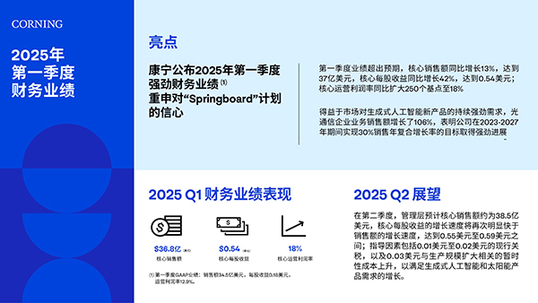 康宁执行副总裁兼首席财务官 Ed Schlesinger 表示:“在第一季度,我们持续提升财务回报水平。核心销售额同比增长13%,核心每股收益同比增长高达42%,运营利润率提升250个基点,核心投资回报率 (ROIC) 提升300个基点。我们的增长势头非常强劲。展望第二季度,我们预计核心销售额将增长至约38.5亿美元,核心每股收益的增速将再次显著超过销售额增速,预计在0.55至0.59美元之间。我们的业绩预期已考虑到现行关税的影响(约为0.01至0.02美元),和生产规模扩大所带来的暂时性成本上升(约为0.03美元),以满足生成式人工智能和太阳能产品的需求增长。”