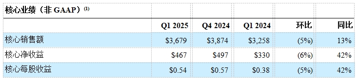 GAAP销售额为 34.5 亿美元。核心销售额为 36.8 亿美元。